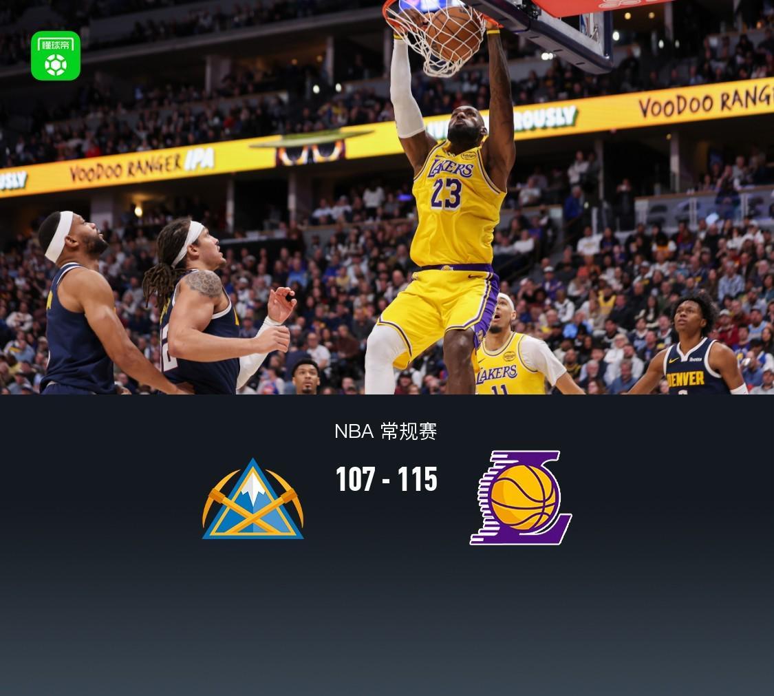 第四节,开节掘金纳吉连续内线吃饼得分,湖人蒂米、八村垒、海斯也同样内线吃饼得分,双方紧咬比分,节中掘金突然断电,湖人斯玛特站出来连中三分一波12-0直接拉开分差,紧跟掘金沃特森、戈登相继三分延续悬念,湖人詹姆斯暴扣得分止血,随后湖人斯马特、东契奇相继罚球得分,掘金继续反扑无果,全场结束,掘金107-115不敌湖人。